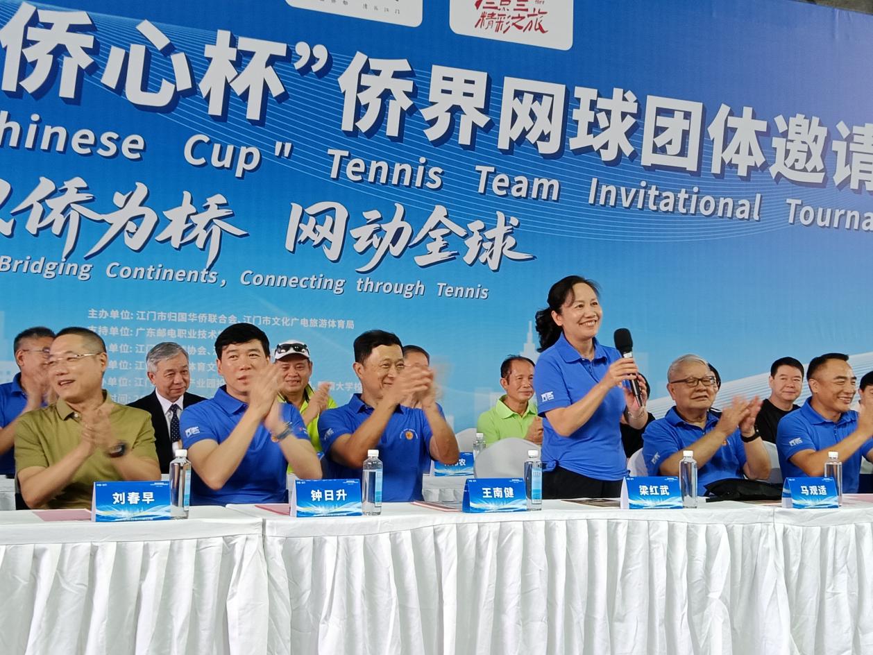 开幕式上,江门市人民政府原市长王南健,广东省侨联副主席钟日升,江门市委常委、统战部部长梁红武,香港著名慈善家、江门市荣誉市民马观适等海内外嘉宾一起为侨界网球团体邀请赛鸣锣开赛、鼓劲加油。